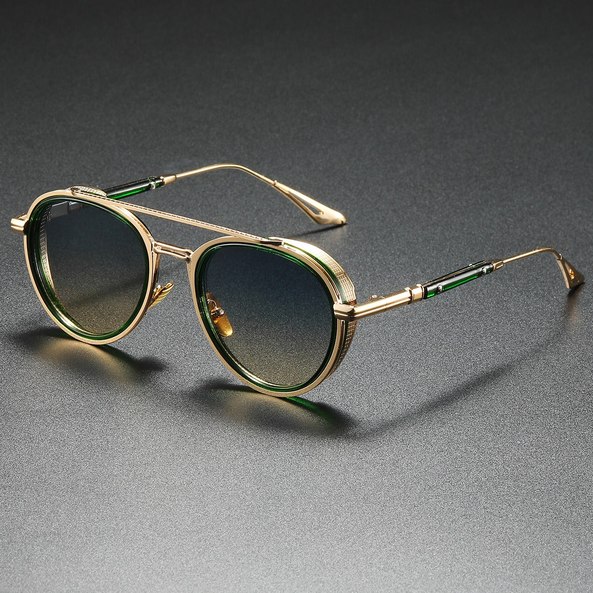 The Cadré Sunglasses blend old-world charm with modern structure—featuring a sculpted round lens, ridged metal rim, and a sleek double-bridge silhouette. Finished with gradient lenses and detailed arms, they’re made for moments that deserve presence, not noise.