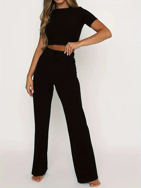 Get ready to make a statement with Rosa - Solid Color Crop Set! This two-piece ensemble features a stylish crop top with an open umbilium design and slim-fit pants for that perfect blend of fashion and function. Embrace your inner fashionista and rock this chic set with confidence!
